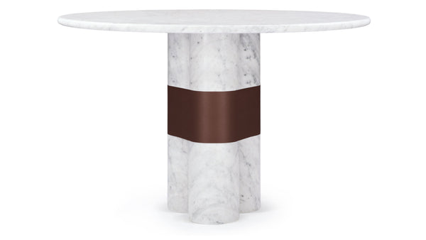 Pedestallbasen har søyler som gjenspeiler elegansen til klassisk arkitektur, og fremhever påvirkninger i symmetri, andel og intrikate dekorative elementer som definerer denne tabellen. De elegante, polerte overflatene av søylene gir en moderne vri til den tidløse designen.
