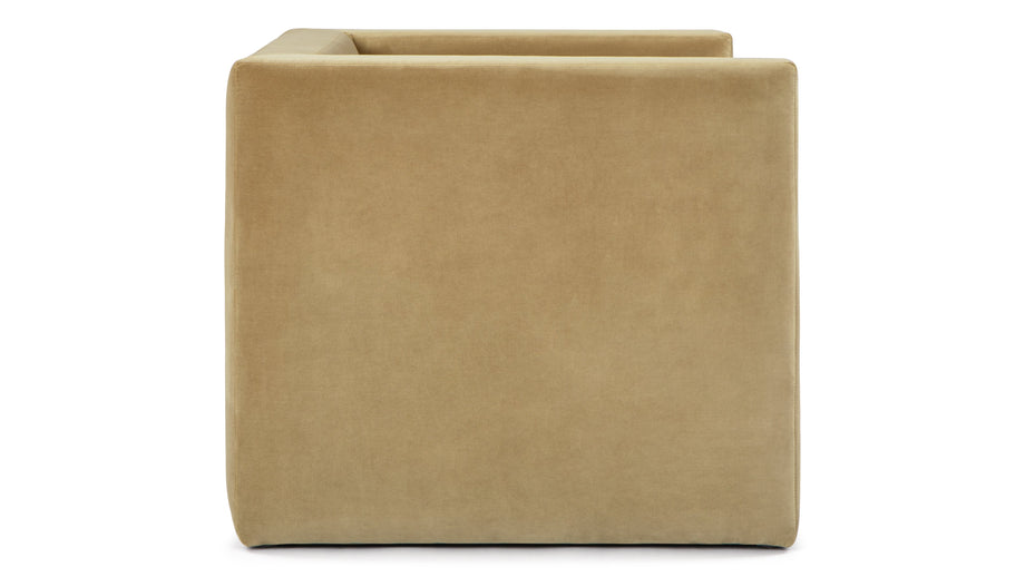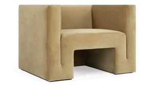A cadeira Olsen Lounge apresenta um design angular contemporâneo, com linhas ininterruptas e uma silhueta quadrada. Seu estofamento de veludo cor de mel reflete suavemente a luz, adicionando uma estética quente a qualquer espaço moderno.